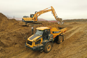 In einem Zeitraum von zwei Wochen ist er damit beschäftigt, rund 10.000 Tonnen Lößboden in Eholfing zu verladen, auf einer Fläche von ungefähr 15.000 Quadratmetern zu verteilen und mit Oberboden zu bedecken. Hierbei setzt er den neuesten knickgelenkten Muldenkipper von Hyundai ein – den HA30A mit einer Tragfähigkeit von 30 Tonnen. Dieses Modell wurde erstmals auf der bauma 2022 der Öffentlichkeit präsentiert.