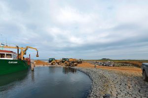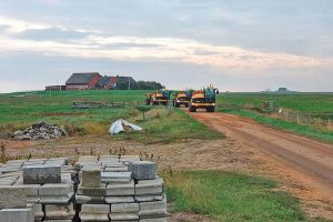 Eine Aufgabe, für deren Bewältigung dem ausführenden Unternehmen drei Hydrema-Dumper vom Typ 707G als am besten geeignet erschienen. Hauptargument für ihren Einsatz war vor allem das niedrige Gesamtgewicht der Maschine sowie ihre für die schmalen Straßen auf der Hallig ideale Baubreite. Hinzu kommt die ca. drei Kilometer lange Fahrtstrecke zwischen dem Anleger und der Warft, die zum Teil mit äußerst schwierigen Bodengegebenheiten aufwartete. Denn an ihrem Ende galt es, den nassen und extrem weichen Boden der Warft beladen hoch und anschließend wieder hinunter zu fahren – für gewöhnliche Radfahrzeuge kaum zu leisten. Wie auf einer Ameisenstraße ständig zwischen Anleger und Warft hin und her pendelnd, kam es bei diesem Job jedoch darauf an, die gesamte Strecke möglichst effektiv zu bewältigen. So schien es letztlich keine Alternative für den Einsatz der 707er zu geben.